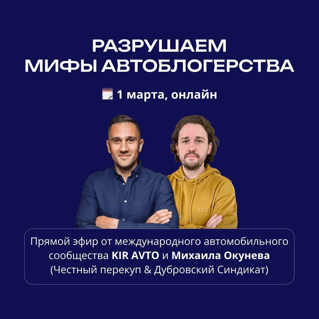 1.03 пройдет бесплатный мастер-класс от международного автомобильного сообщества KIR AVTO и Михаила Окунева (Честный перекуп & Дубровский Синдикат), где в прямом эфире спикеры разрушат главные мифы автоблогерства:
