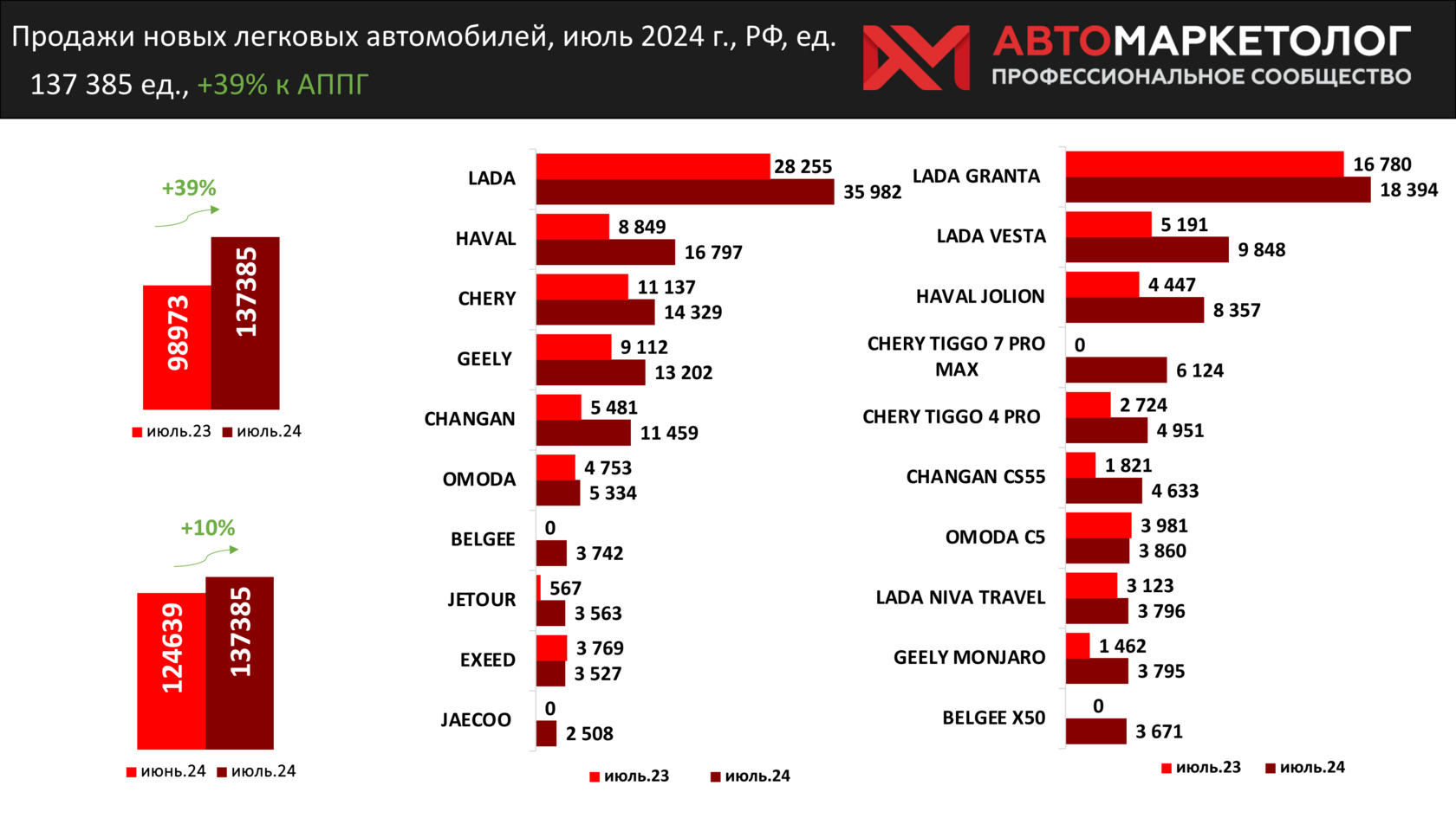 | Авторынок России в июле: данные статистики Автомаркетолога | | | | По данным «Автомаркетолога», в июле этого года в России было продано 137 385 новых легковых автомобилей. Это на 39% больше, чем за июль 2023 года — 98 973 ед. На 10% авторынок вырос относительно продаж за июль, когда было продано 124 639 машин.