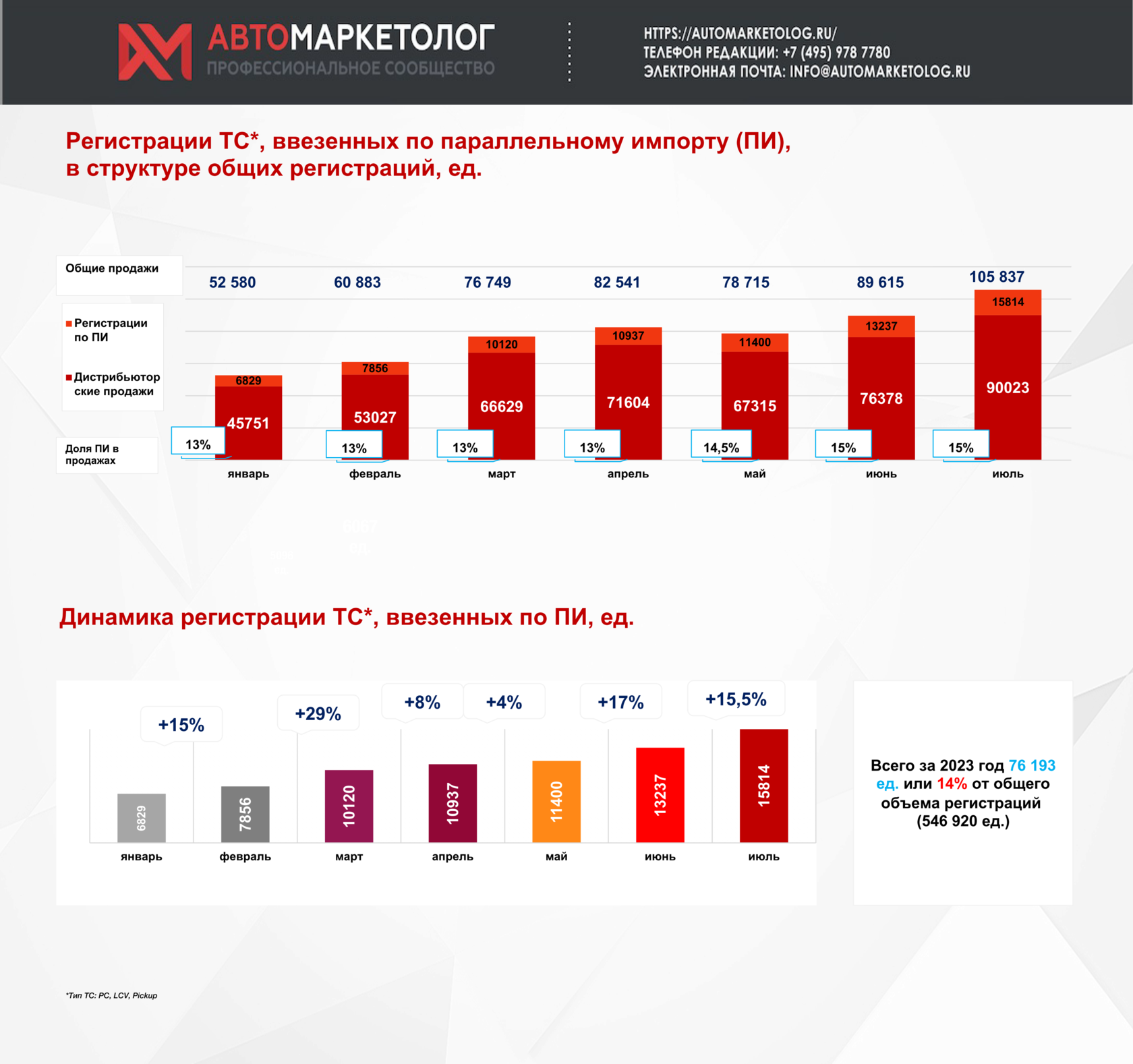 | Эксперты компании «Автомаркетолог» и «Открытие Авто» (блок автобизнеса банка «Открытие») проанализировали объемы регистраций автомобилей, ввезенных Россию по каналам параллельного импорта. В июле было зарегистрировано 15 247 таких машин , на 15% выше июньских регистраций. Всего с начала года и по июль включительно на российском авторынке было зарегистрировано 75 626 ТС, импортированных по схеме параллельного импорта, или 13,8% от общего объема автомобилей, проданных в стране в этот период (547 тыс. а/м, включая официальные продажи и «серый» импорт).