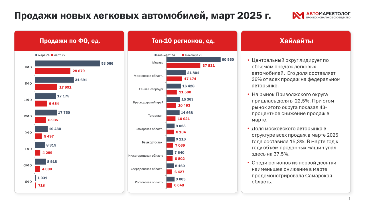 | По данным «Автомаркетолога», Центральный округ лидирует по объемам продаж легковых автомобилей. В марте текущего года здесь было продано 28 879 машин, что составило 36% от всех продаж на федеральном авторынке. При этом в сравнении с прошлым годом продажи новых машин в ЦФО упали почти на 46%.