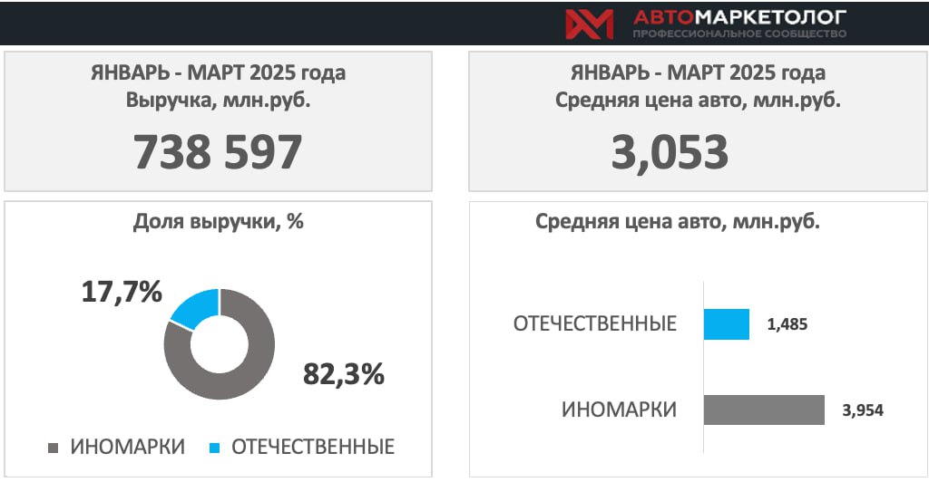 Наибольший объем выручки формируют иномарки: в первом квартале 2025 года их совокупный оборот составил 607,6 млрд рублей, что эквивалентно 82,3% от общего объема авторынка. В свою очередь, отечественные производители обеспечили 131,0 млрд рублей или 17,7% общего оборота. Различие заметно и в показателях средневзвешенной цены автомобиля: • Иномарки — 3,95 млн рублей • Отечественные марки — 1,49 млн рублей
